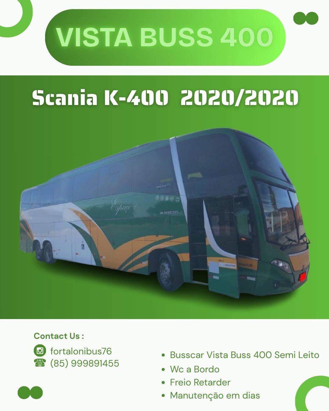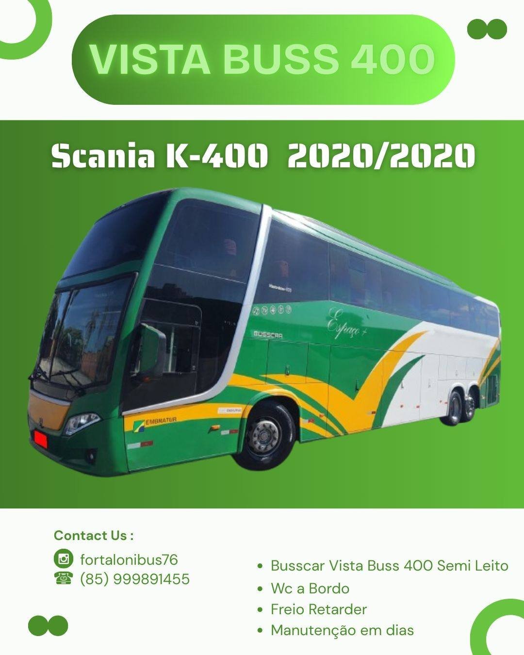 🧰 Vista Buss 400 🧰 Scania K-400 🧰 *Ano-2020/2020* 🧰 Manutenção 100% 🧰 Semi-Leito 🧰 40 Poltronas 🧰 Tomadas USB 🧰 Wc a Bordo 🧰 Frigobar 🧰 Cama